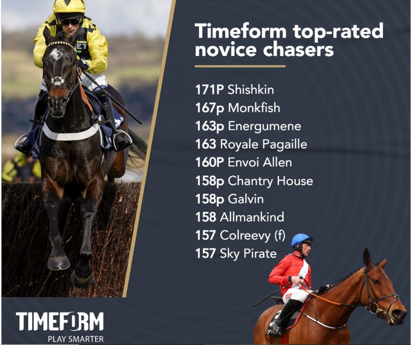 So, what rating does the winner warrant? It may sound strange for a horse that has now had four runs over fences, but, as he keeps winning so easily, there is still no knowing how good he is. I decided to credit him with a revised rating of 169. In the context of the Arkle, that makes him the joint-highest rated winner of the race this century, level with the figure recorded by his stablemate Sprinter Sacre in 2012 and higher than the 165 given to Altior (another stablemate) for winning the 2017 renewal. He is obviously the star of the division and is currently the highest rated novice chaser across all distances. In the 2m novice chase rankings he is followed by Energumene (164), Allmankind (160) and Sky Pirate (160), the last-named given that rating for winning the Grand Annual handicap off a mark of 152. In the overall 2m rankings only Chacun Pour Soi on 172 sits above Shishkin, underlining what an exciting prospect he is.