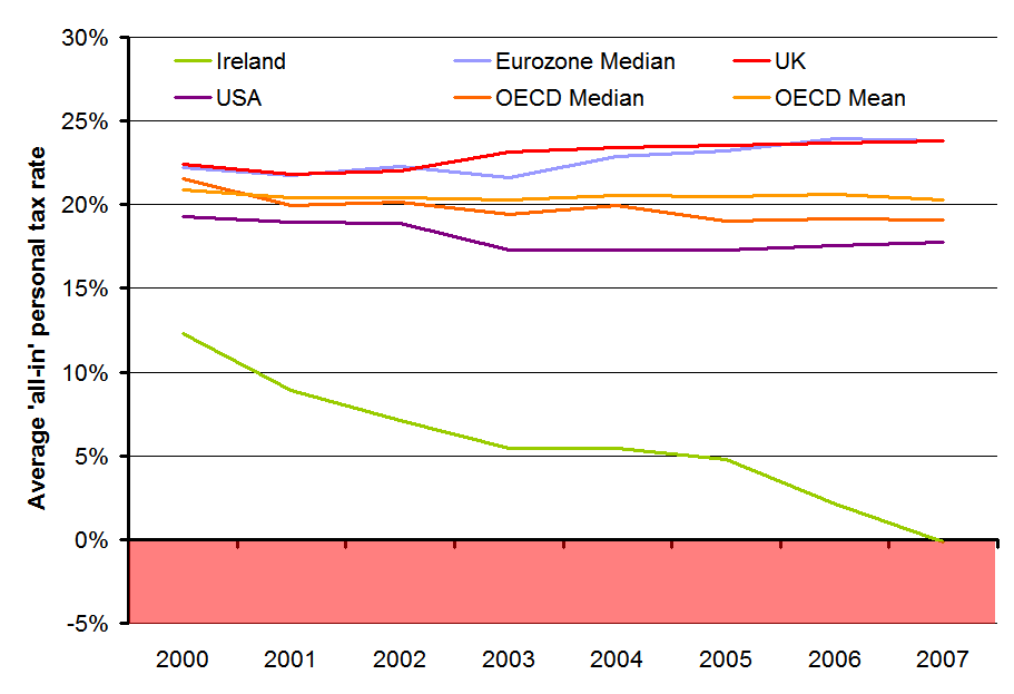 In fairness to Ireland, these figures probably underestimated the tax burden we faced in 2007. Because GDP overstated Irish economic activity, as it includes profits of multinational corporations in Ireland. And because such taxes are taxed at 12.5%.